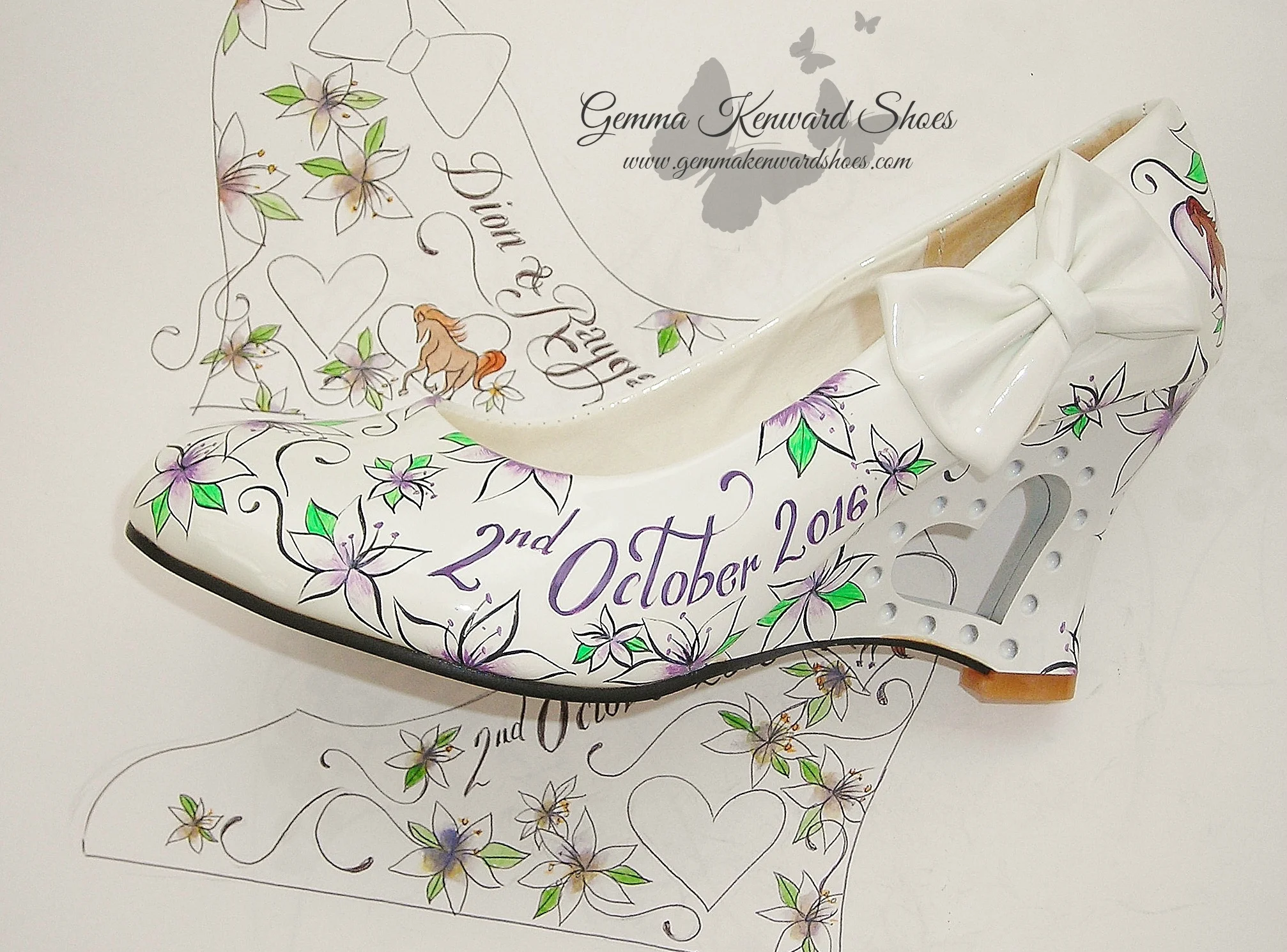 The design for the brides wedge shoes was simple, flowers and horse portraits as well as the ever popular names of the bride and groom on one side of the bridal shoes and the date of the wedding on the other shoes, all hand painted in purple script.