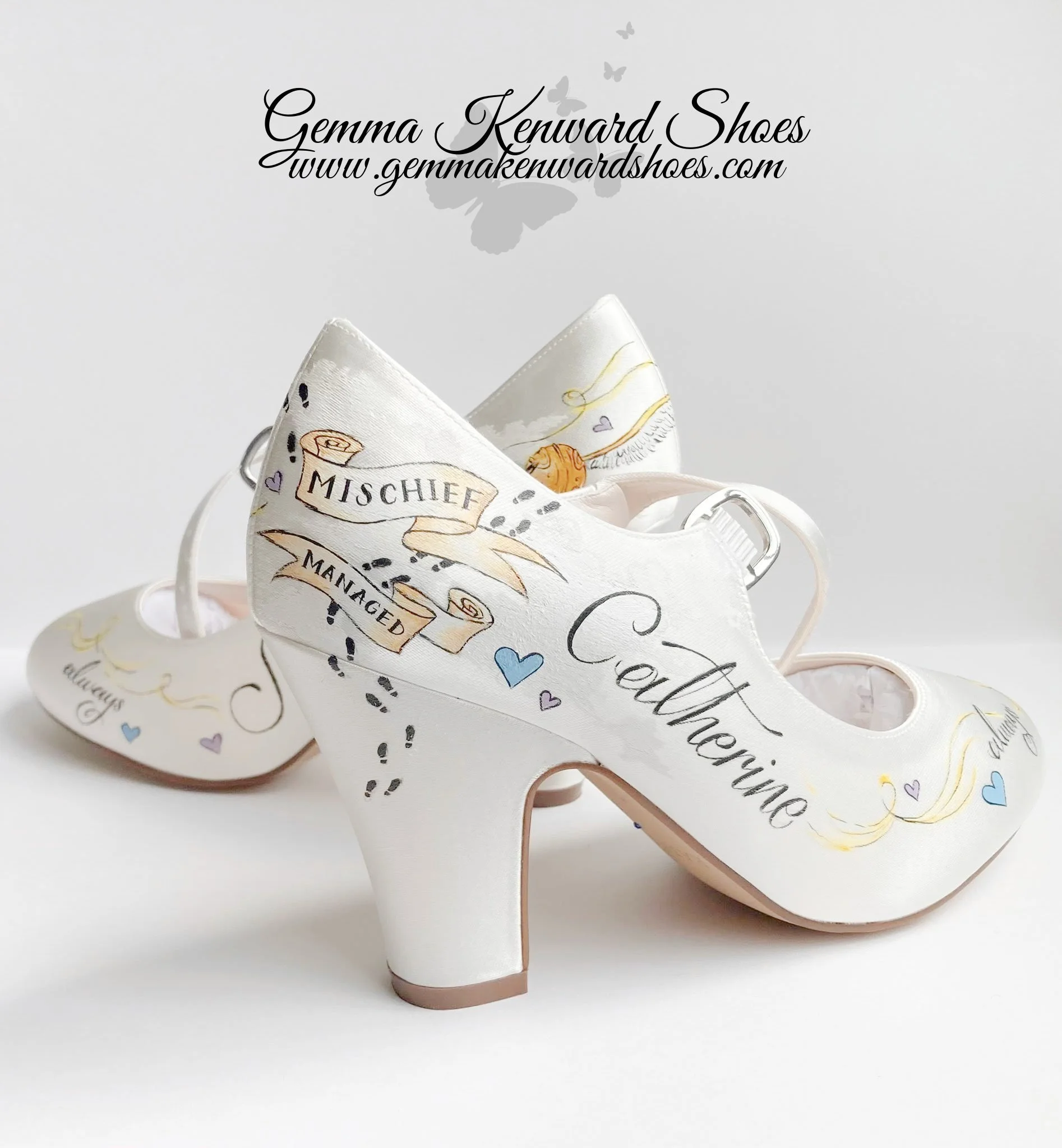 Mischief Managed bespoke painted wedding heels painted with a Harry Potter and Disney theme